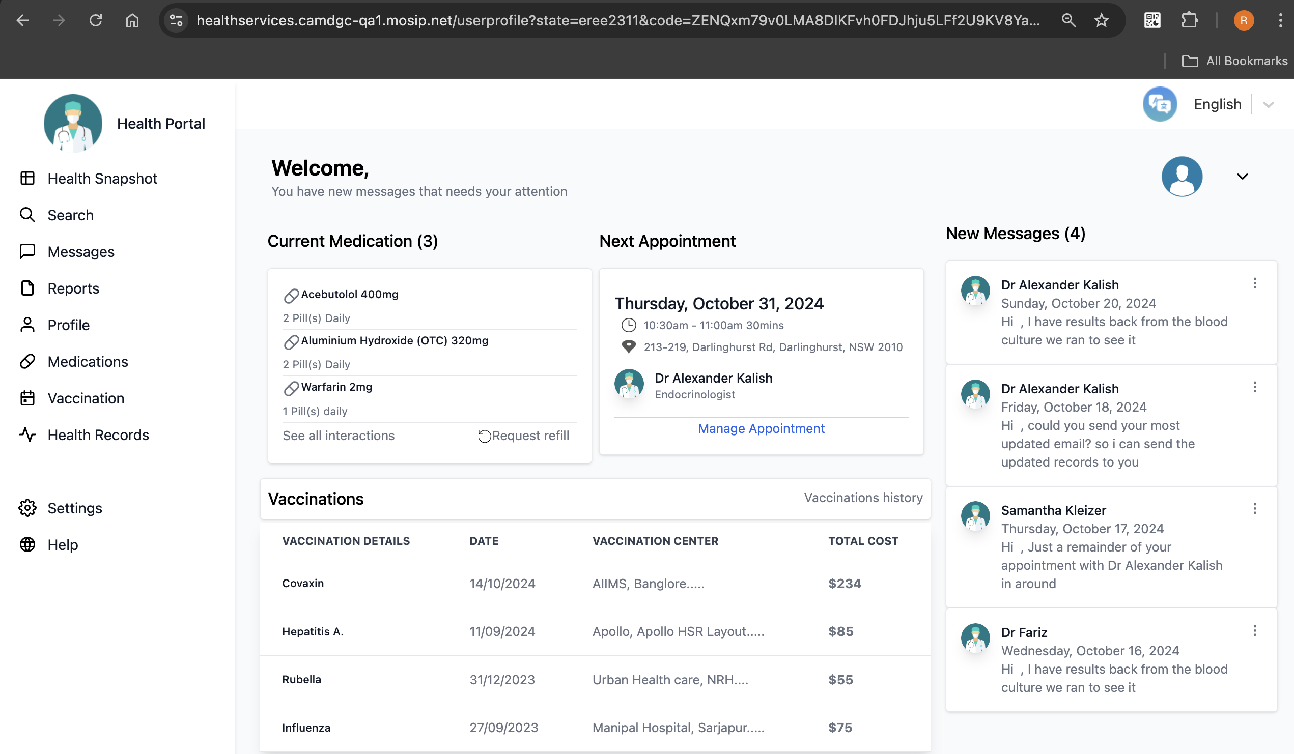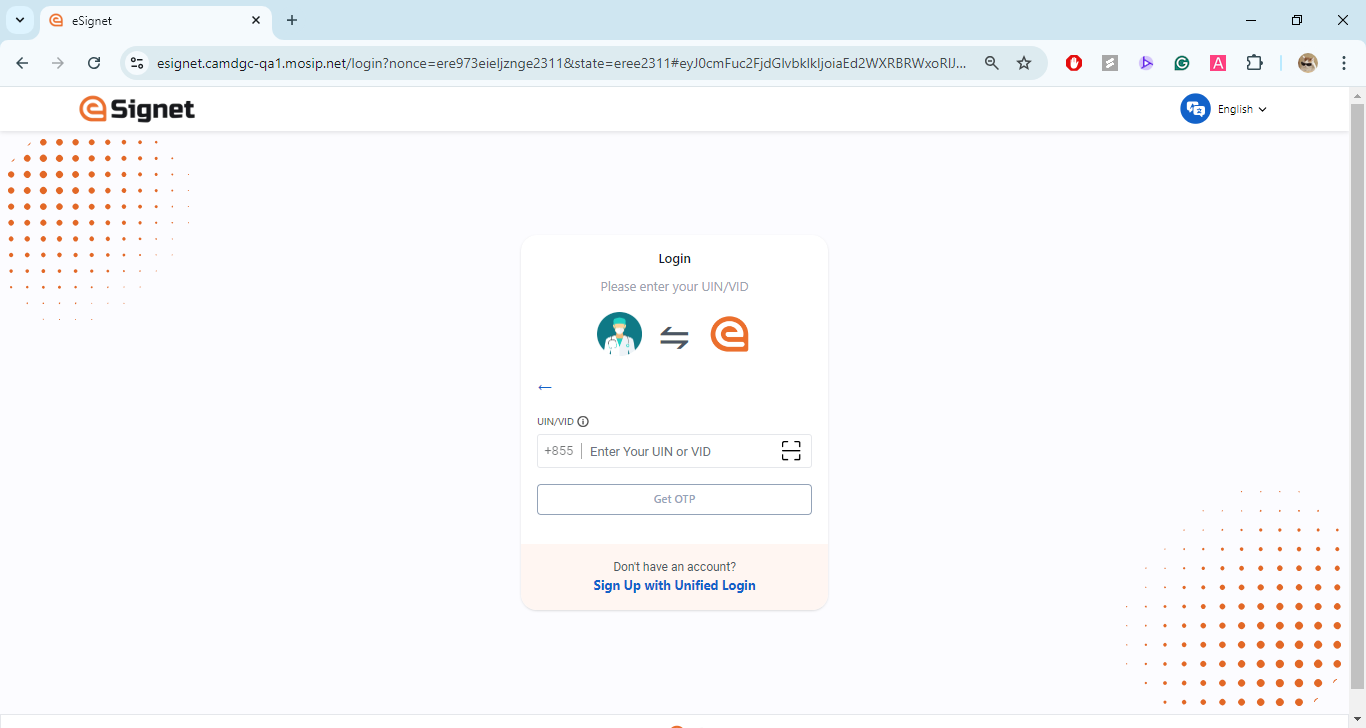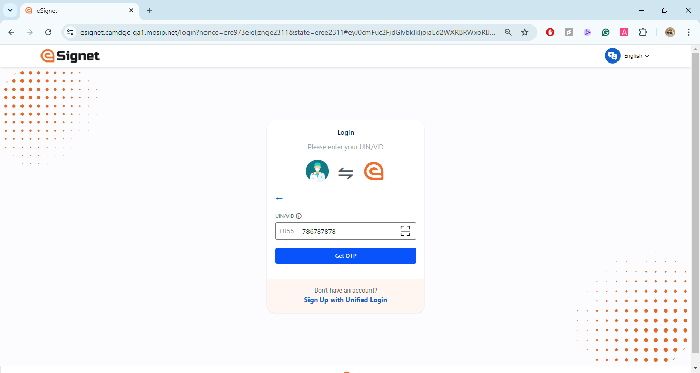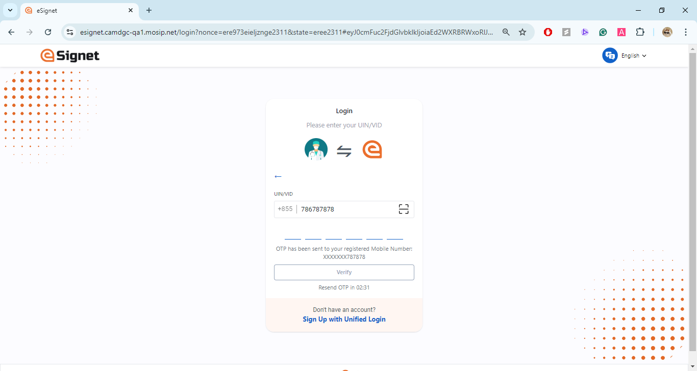 The resident is issued with a unique virtual ID for a country's foundation ID. In the below demo application, which is a health portal, the resident is registered with MOSIP and has a valid UIN or VID.