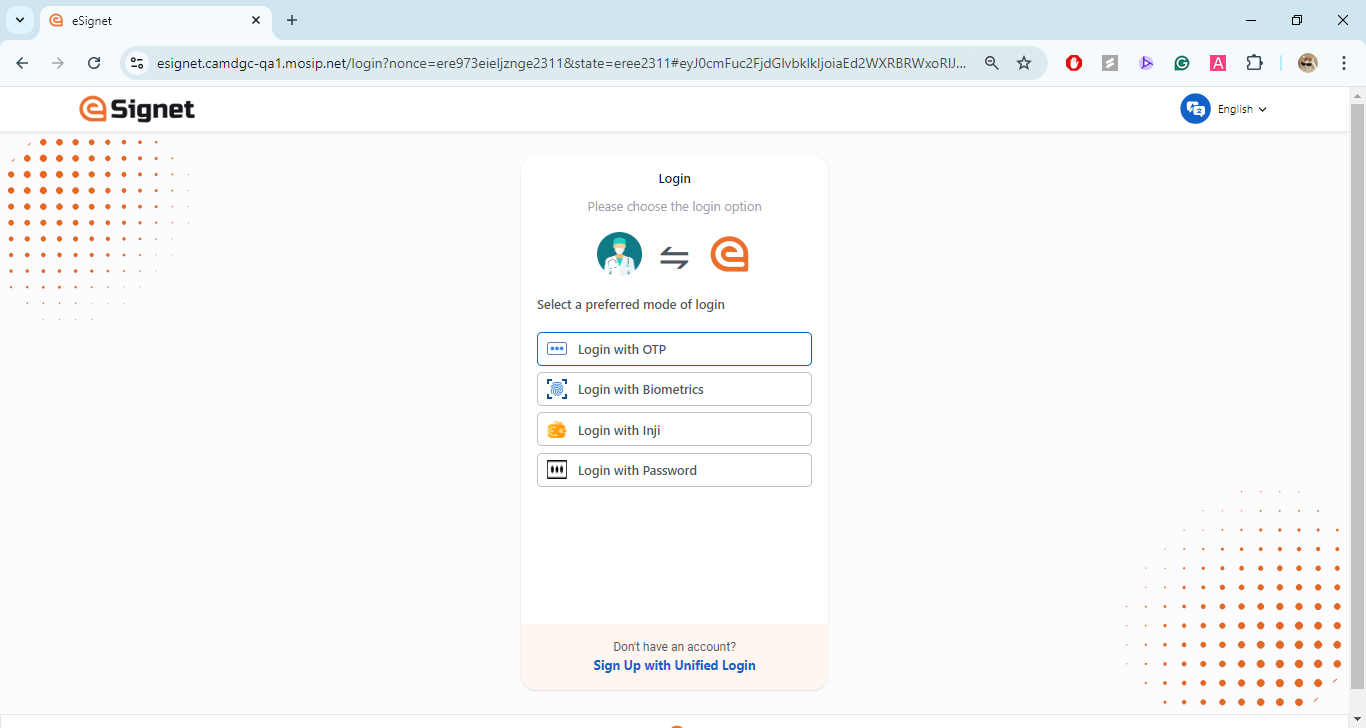 <figure><img src="https://3349261888-files.gitbook.io/~/files/v0/b/gitbook-x-prod.appspot.com/o/spaces%2FylzvZHp30DQ3rNCClELV%2Fuploads%2Fgit-blob-bd9fb62fd90083b58552e802c88f3a41c61b58f0%2FHealth%20services%20home%20page.png?alt=media" alt=""><figcaption><p>Sign in with eSignet</p></figcaption></figure>