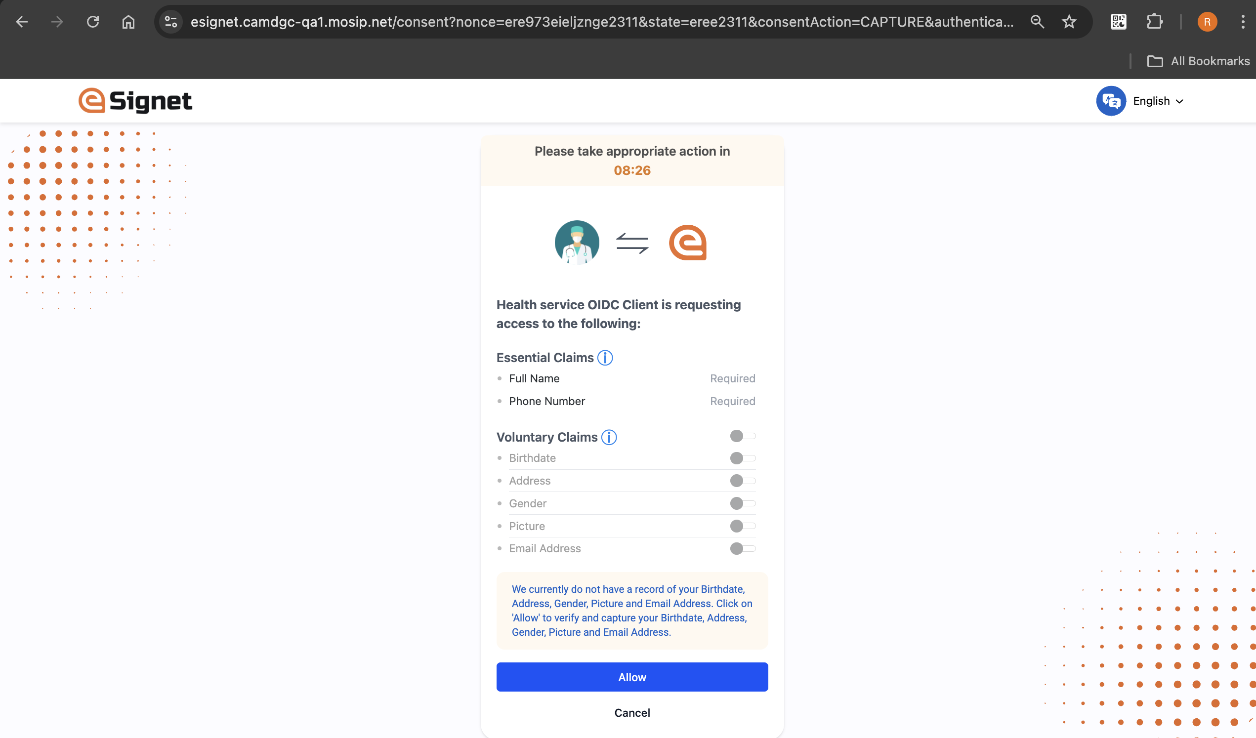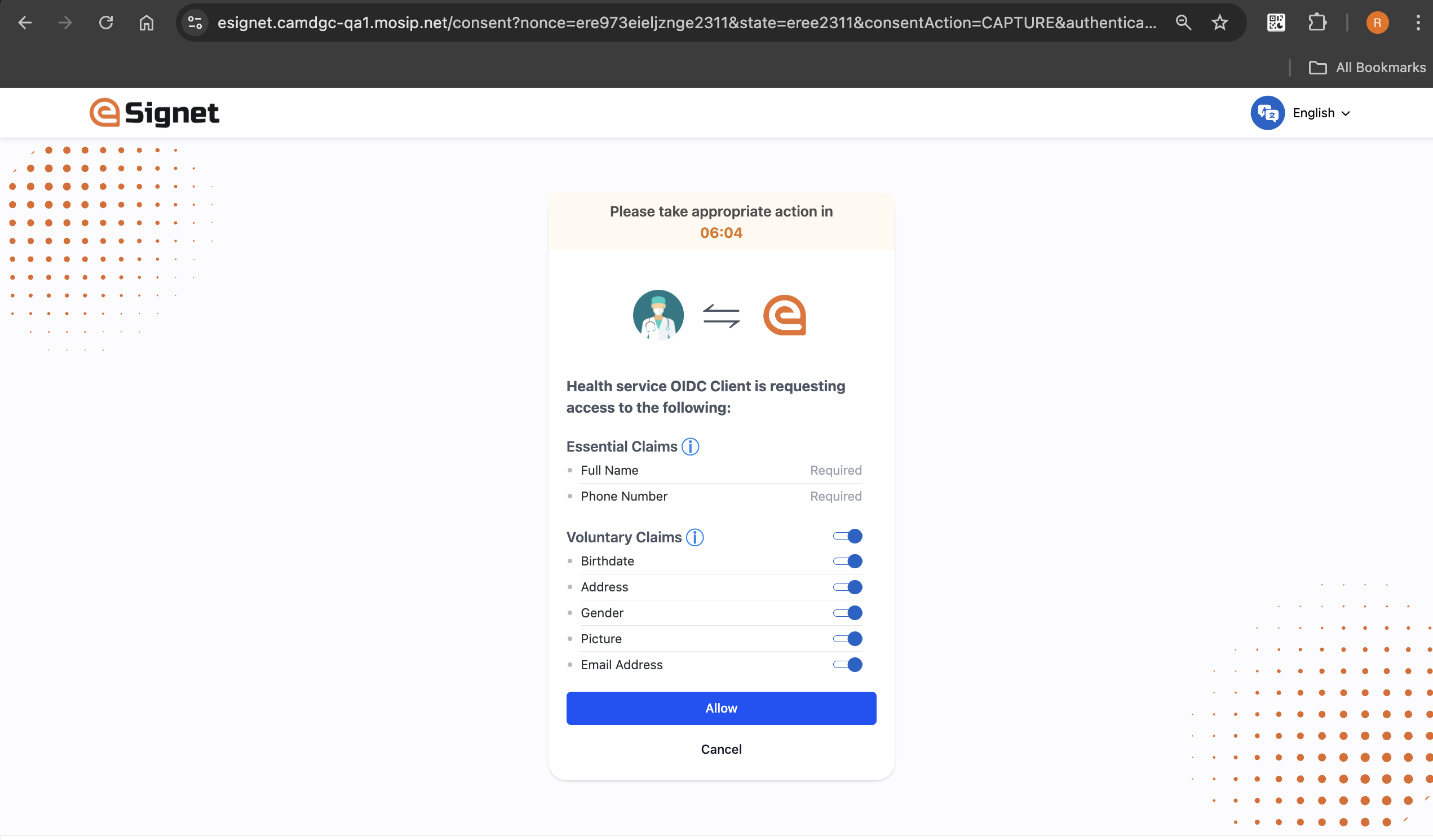 8\. The resident is given the option to choose from a list of Authorized scopes and Voluntary claims. The Essential claims are mandatory and cannot be modified. A **master toggle button** has been added to allow residents to select all the options at once if desired.