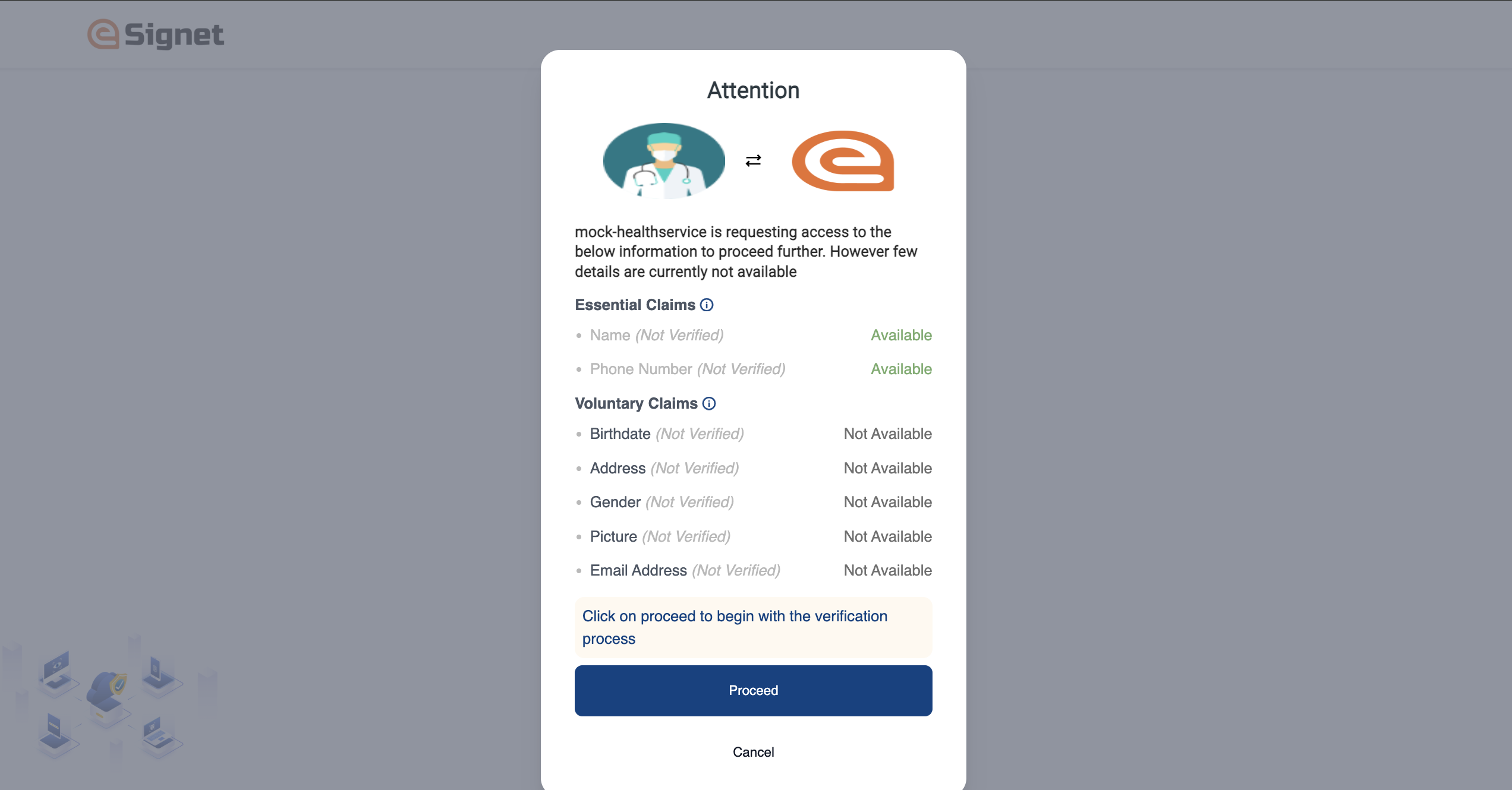 For the Identity (eKYC) verification process, eSignet includes a built-in feature to inform the user when certain verified claims are unavailable. A popup is displayed, showing details of the missing claims and prompting the user to initiate the verification process. Detailed consent regarding the Personally Identifiable Information (PII) that will be captured during the verification will be handled through the SignUp portal.