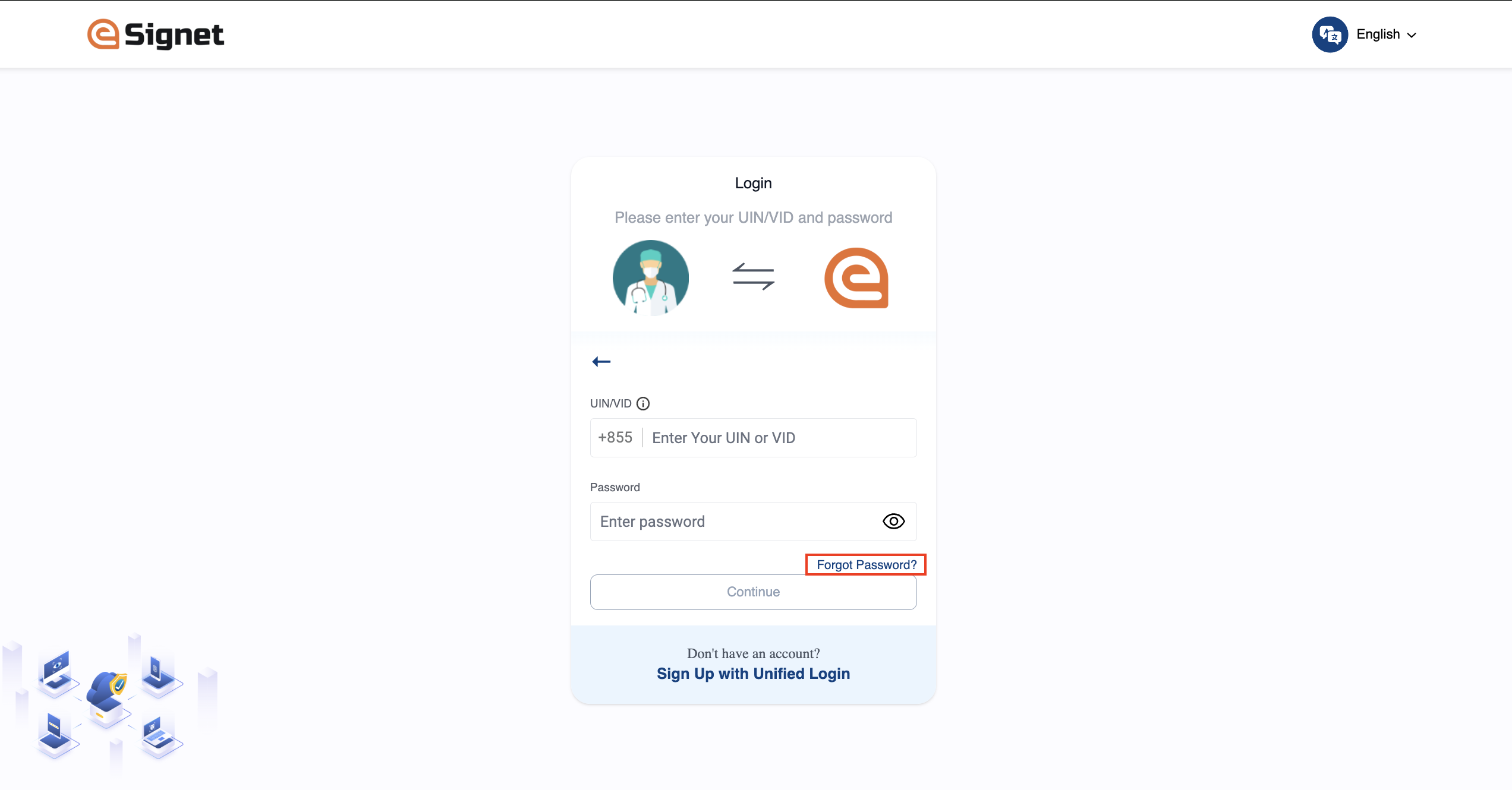 <figure><img src="https://3349261888-files.gitbook.io/~/files/v0/b/gitbook-x-prod.appspot.com/o/spaces%2FylzvZHp30DQ3rNCClELV%2Fuploads%2Fgit-blob-e876227d65b5b296d7c6512248d1d7e0ab28f133%2FeSignet_forgot_password.png?alt=media" alt=""><figcaption><p>Forgot Password Page</p></figcaption></figure>