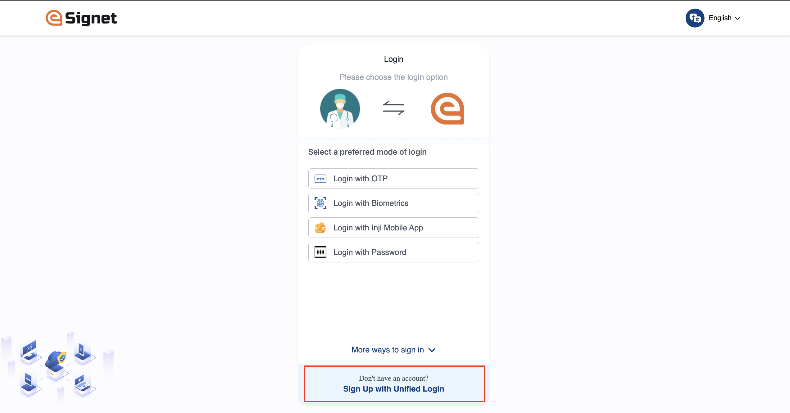 <figure><img src="https://3349261888-files.gitbook.io/~/files/v0/b/gitbook-x-prod.appspot.com/o/spaces%2FylzvZHp30DQ3rNCClELV%2Fuploads%2Fgit-blob-f00bb3565333136d8f52b380af9cdf1cedc07fe6%2FeSignet_Auth_screen.png?alt=media" alt=""><figcaption><p><strong>SignUp Option on Authentication Screen</strong></p></figcaption></figure>